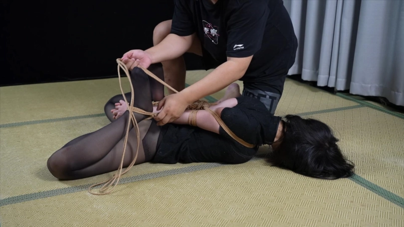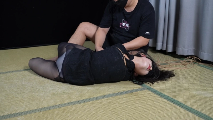 眼睛被丝袜蒙上,直臂以后被四马攒蹄的绑着
