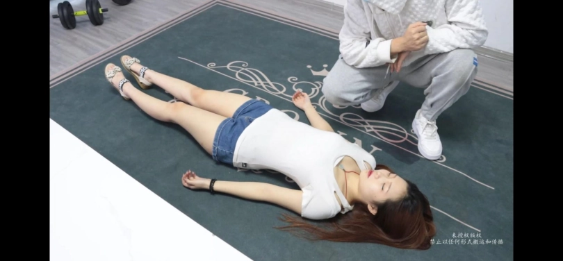 妹子被渣男家暴打晕,丢弃在地上不管不顾,被巡逻的物管看到,尽情摆弄妹子没有知觉的身体。