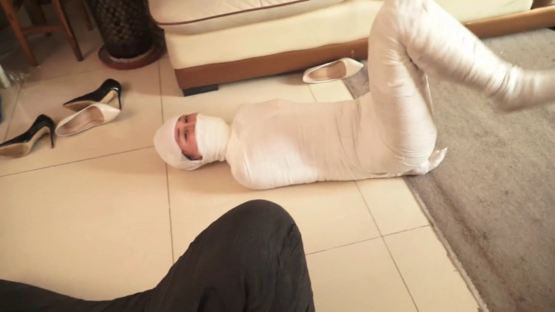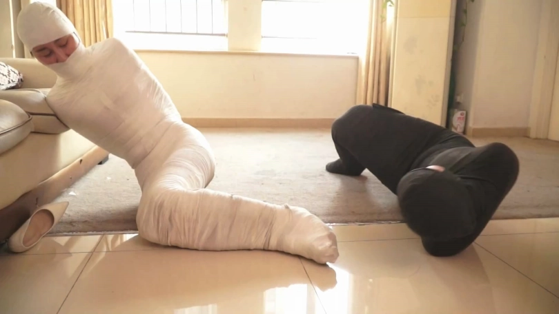 之后2个被包裹的只露眼睛的木乃伊美女的各种挣扎,互相磨蹭,累的全身香汗淋漓。