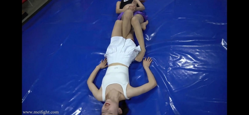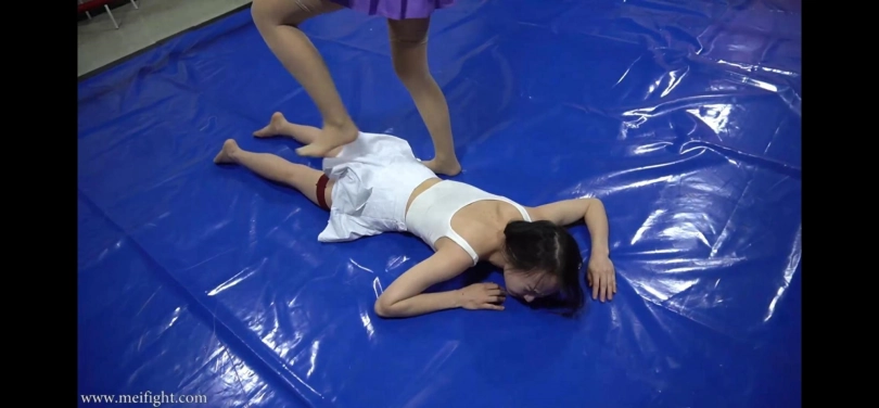 两个丝袜美女大打出手,用各种方法蹂躏对方,摆出各种羞耻姿势,最终紫色衣服美女战败倒地昏迷不醒。