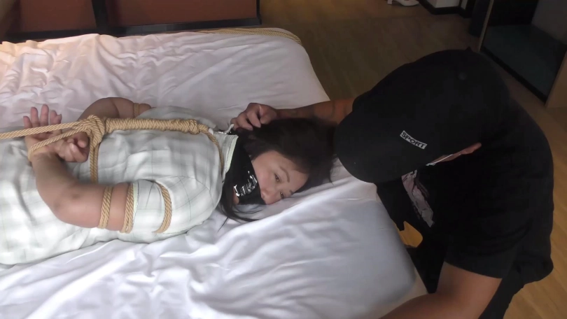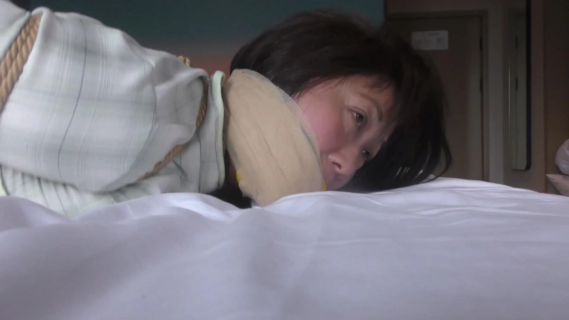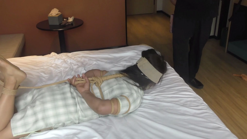 歹徒去翻找财物,老阿姨奋力挣扎弄松绳结,准备解开绳子逃跑,但被歹徒发现严厉捆绑并捆成驷马。