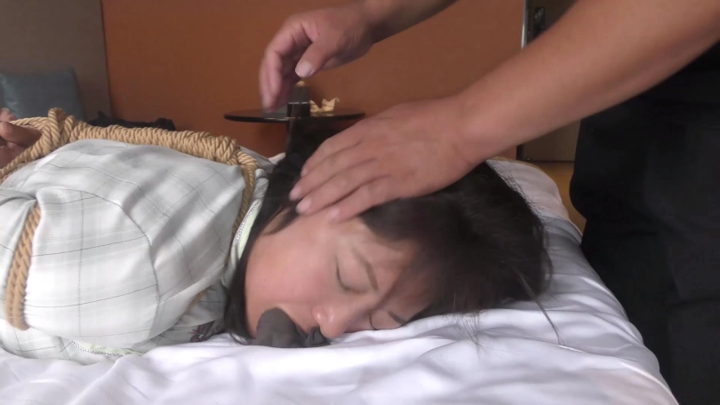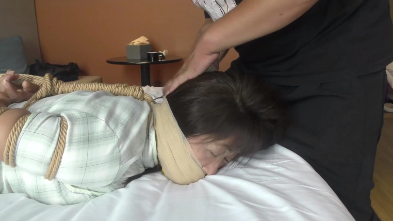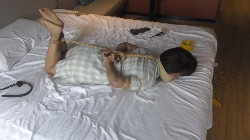 歹徒脱掉老阿姨脚上穿的一双肉色锦纶丝袜,撕开封嘴胶带把短丝袜拽出丢掉,强行把原味肉色锦纶丝袜一只只塞到老阿姨口中,外面用黄色强力胶布封好,再缠绕黑色胶带多圈和自粘绷带封严实。