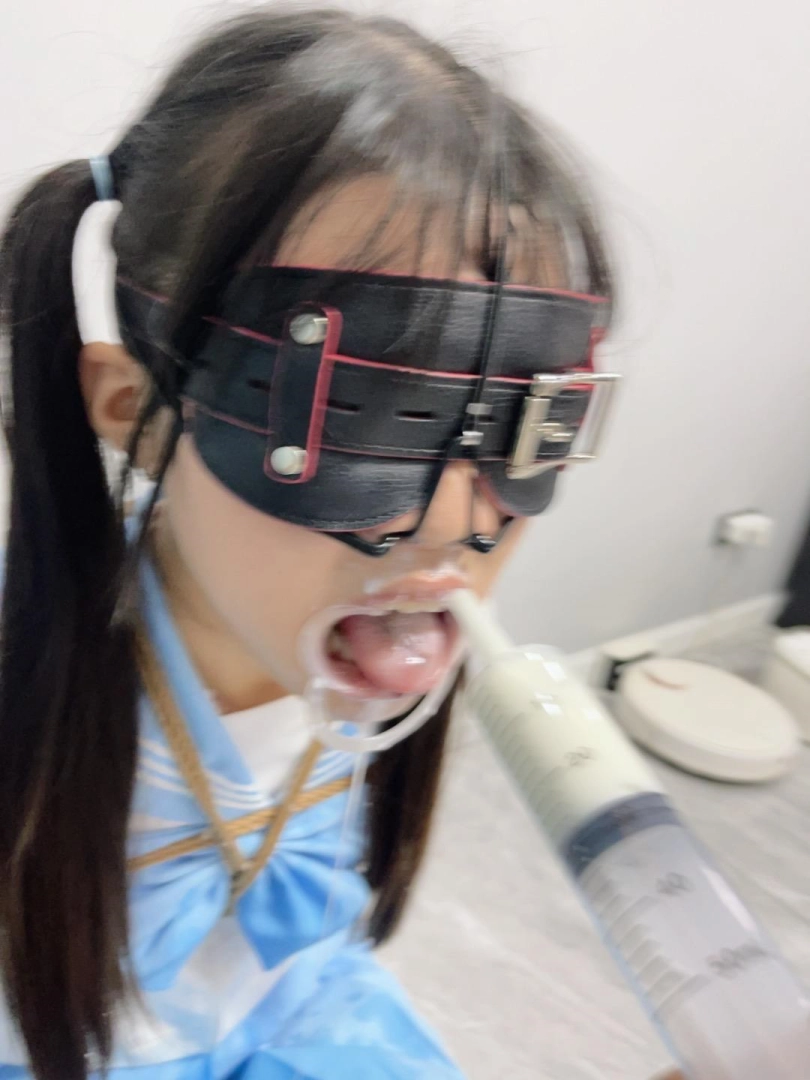 用鼻饲针筒抽出牛奶,塞入妹子的鼻孔里,用最大力气按压针筒,让牛奶喷射进妹子的鼻孔,从口腔流出。