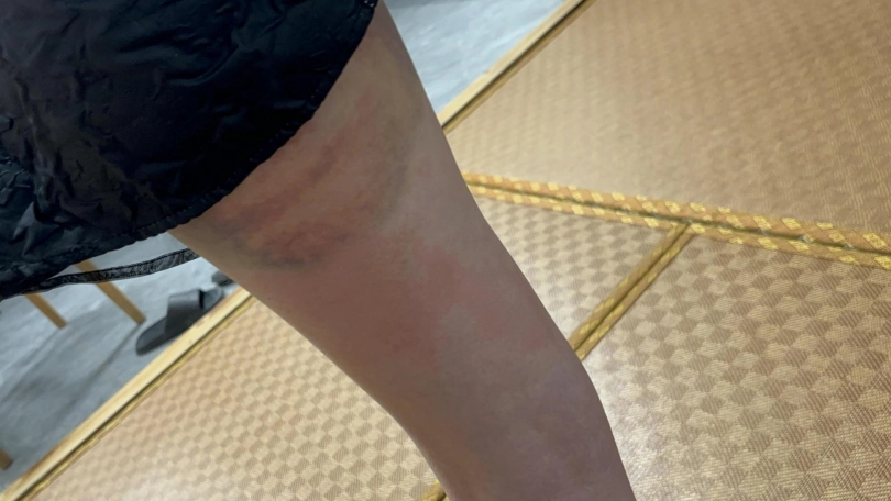 楠楠被老员工珺珺报复,因为珺珺嫉妒楠楠的腿太白,所以给楠楠腿都打青了
