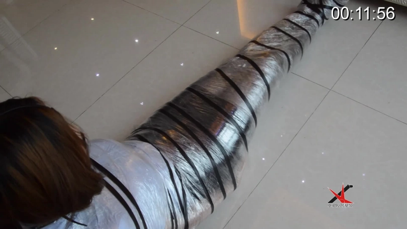这次用的是店里的020号拉伸膜,拉伸膜是工业用的保鲜膜,硬度要比一般保鲜膜大,所以妹子想要挣脱开来必须用高跟鞋吧下面的捅破再从足部慢慢挣脱。