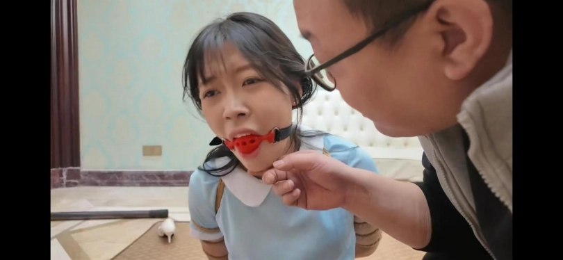 将小智调戏了一会后,勇哥拿来一个手机支架,将手机立了起来,镜头正对着小智,说自己开启了录像功能让小智尽情的表演,然后就离开了。勇哥走后,不想被拍到的小智就不停的挣扎,可是怎么挣扎也挣脱不了。