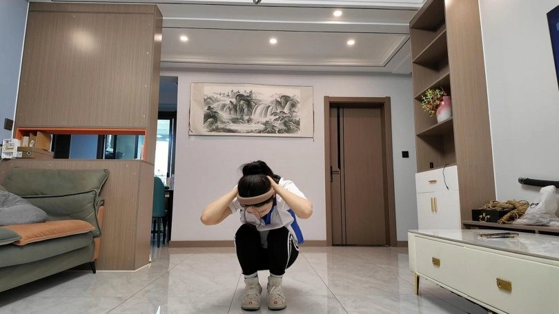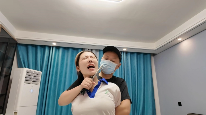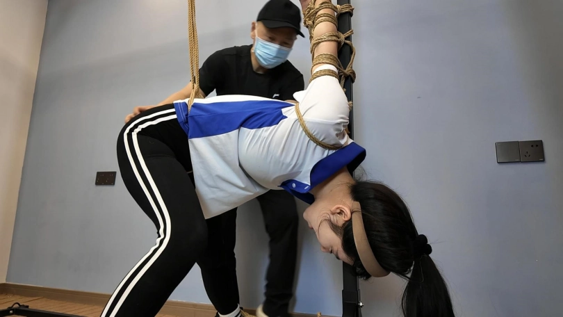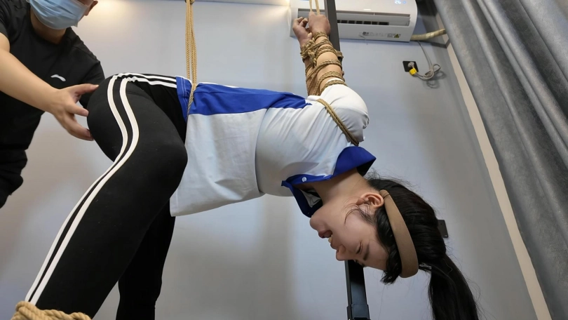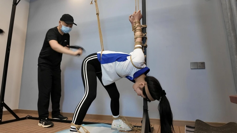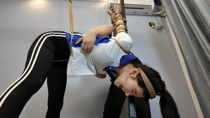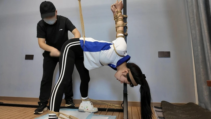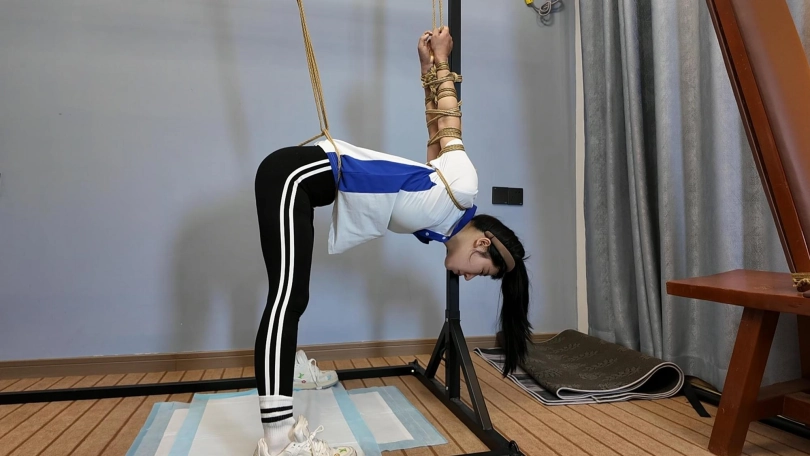 十一在家做操,被潜入歹徒挟持,先体罚,又直臂倒绑到老虎凳上面调叫,直到失禁,水花四溅