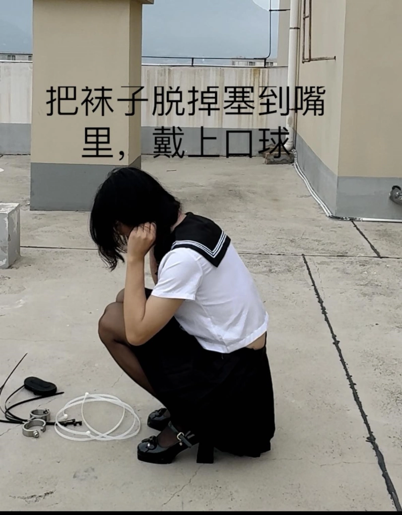 依然是jk制服➕黑丝袜,这次换了个薄一点的。来的时候运动鞋穿着黑丝和白袜,自缚的时候把白袜脱下直接塞到了嘴里再戴上口球 拿下来的时候袜子已经被口水浸润了!!