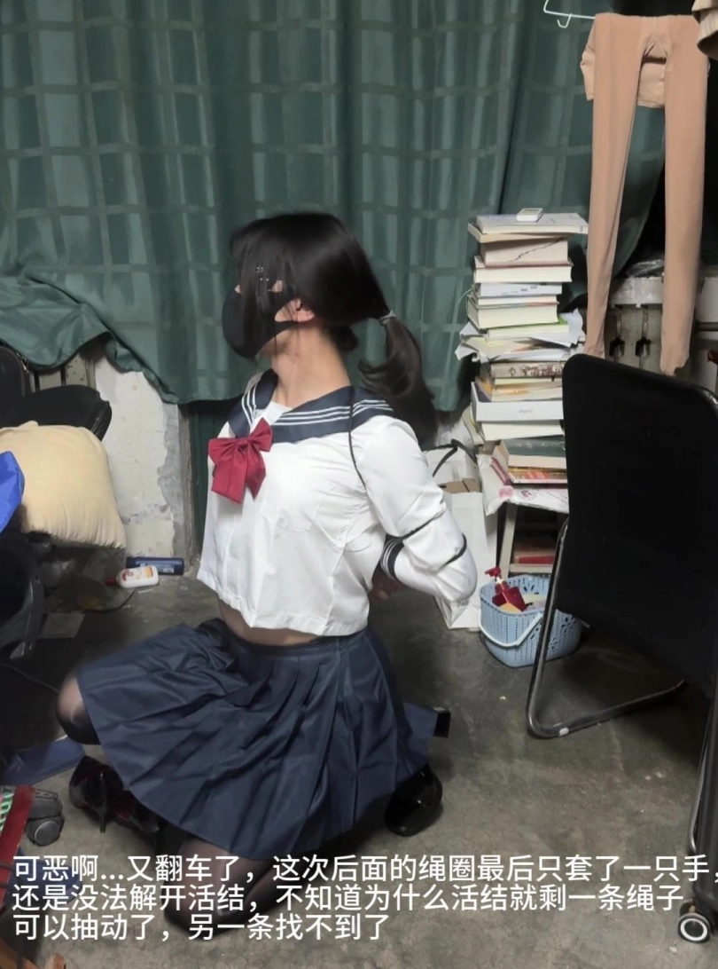本来想录一个简单的一根绳子的五花后手自缚,再加上定时锁,没想到第一个视频的时候活结就解不开了,而且高跟鞋又特别挤脚,幸好找到了桌子上的小刀才免于一死......后面不信邪,我又重新拍了一次,结果在绑好之后活结还是不开,第一次的小刀我又忘记随手扔到哪里了,以为这次肯定没事的,吓的我把眼罩弄掉,终于摸到了舍友桌子上的一把小刀,还割了两次绳子才把手腕解开…