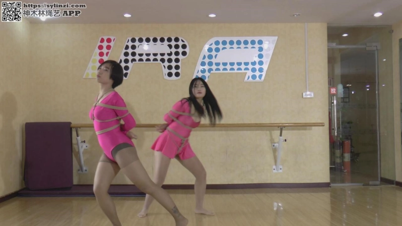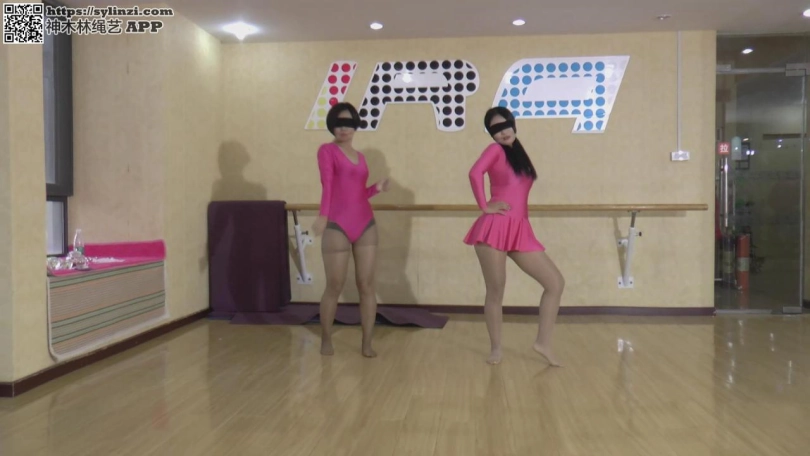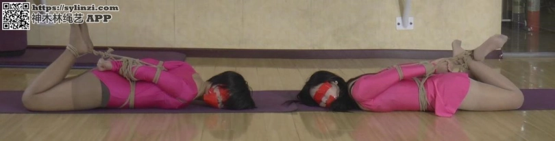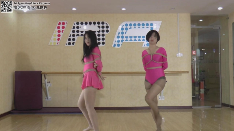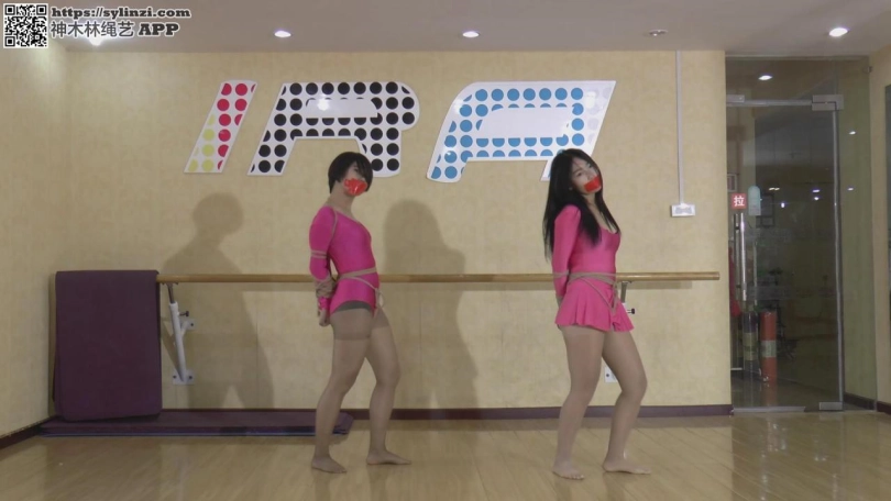老师:两位美女好好跳啊,我们老板也会来看的。 二女:好。 老师:我们老板,想给你们增加点难度,你们先放松一下。 老板:来换个绑法,再封住嘴巴。 老板:注意用鼻子调节呼吸啊! 老板:跳得不错,休息一下吧!当然,不能用普通的休息方法啦!先来个驷马。 眼睛也用胶带蒙上。看看你们配合能力如何了,多久能逃脱。 舞者1:呼,终于。。。 舞者2:呜呜呜呜(别忘了我)。。。。 舞者1:真想先调戏你一下,可惜没时间了。 老板:行,时间上还说的过去。最后再看看你们不绑手脚,只蒙眼封嘴能做到如何吧。