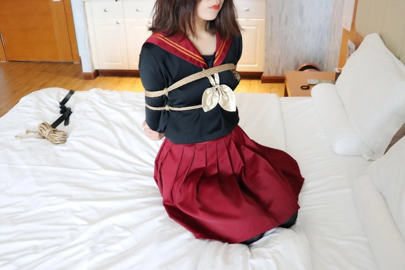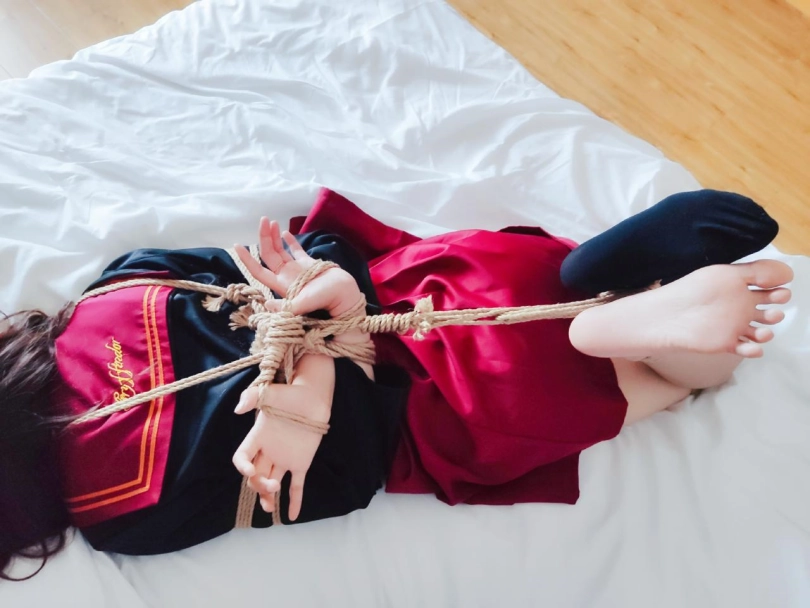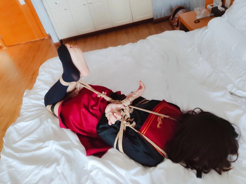 手腕交叉吊高,两个大拇指也用绳子绑在一起----