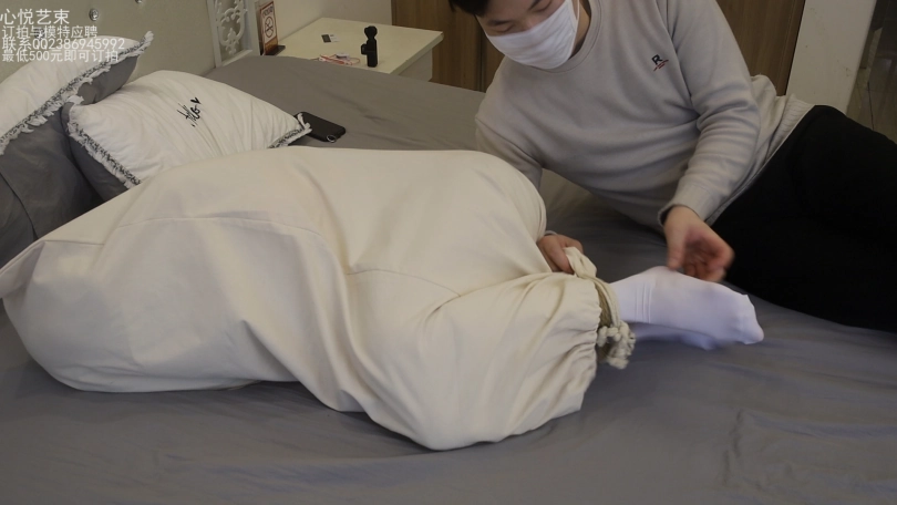 雅雅趴在床上玩手机 没有注意到绑匪靠近 绑匪把她捆了起来 雅雅大声喊救命 绑匪拿了一团袜子塞进她嘴巴里 又拿一条袜子勒住她的嘴 雅雅在床上拼命挣扎 绑匪打她的屁股让她老实一点 绑匪拿出一条麻袋 抓起雅雅的白丝脚往麻袋里装 雅雅被整个塞进去了麻袋 绑匪用手抓紧袋口任凭雅雅在麻袋里挣扎 拿起一条绳子把袋口扎紧 把麻袋在床上放置了一会 绑匪把麻袋抱在怀里 不停地揉捏麻袋里雅雅 隔着麻袋挠她的身子挠她的脚 麻袋里的雅雅只能拼命蠕动发出呜呜的呻吟 雅雅在麻袋里呜呜的说我要上厕所 绑匪把麻袋放在地上 打开了袋口 把雅雅放了出来 绑匪扶着雅雅站了起来 绑匪一回头 雅雅想要逃跑 蹦跳着往外走 但是绑匪逮住了她 并拿起麻袋罩在她头上 又一次把她装进麻袋 把腿蜷缩进麻袋只留一双白丝小脚在袋口拼命挣扎 绑匪开始挠雅雅在脚 挠了一会 绑匪把她的脚也按进麻袋 把麻袋口用绳子绑紧 打她屁股 最后只留雅雅在麻袋里蠕动翻滚